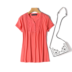 夏季新款T恤衫镂空刺绣套头上衣女文艺修身舒适弹力衫打底衫Pb3