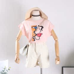 H@13夏季新款圆领百搭套头简约上衣抽象人像印花宽松T恤女