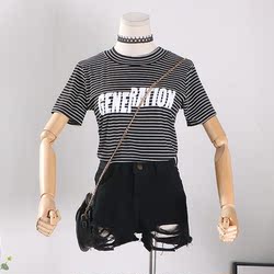 H@16韩版新款圆领领细条纹前字母图小清新百搭短袖学生T恤女