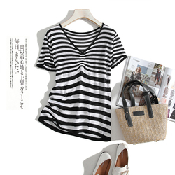 经典款!夏季女 百搭款冰丝MAV领显瘦黑白条纹短袖T恤上衣S00766