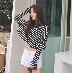 春夏秋小心机t恤女黑白条纹高腰性感漏肚脐跳舞上衣短款宽松长袖