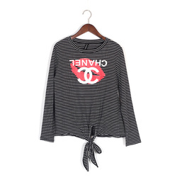 桔子家2017秋新品韩版圆领长袖针织弹力上衣条纹印花T恤打底衫女