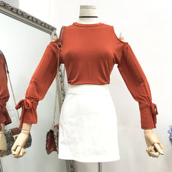 H@06新款时尚潮流韩版圆领露肩套头上衣女纯色甜美学生T恤