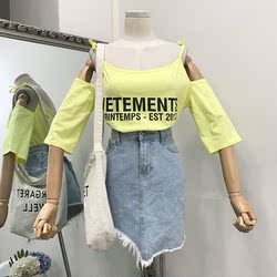 H@18夏季新款拼接字母吊带露肩时尚潮流百搭女装T恤