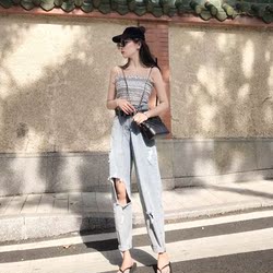 港味新款显瘦复古条纹吊带背心+高腰膝盖破洞裤宽松潮版牛仔裤女