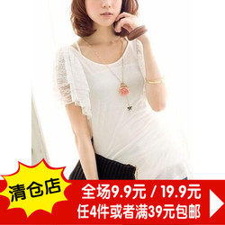 2017韩版夏新款纯棉女式蕾丝袖蝴蝶袖圆领纯色蝙蝠袖短袖T恤1001