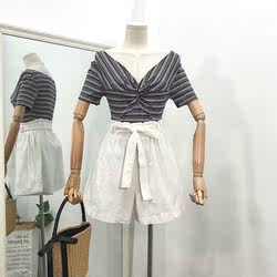 G@14针织衫夏季新款短袖修身显瘦百搭上衣韩版条纹V领女装T恤