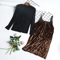 K7 秋季新纯色打底衫+PU皮吊带裙女金丝绒连衣裙口袋两件套百搭潮
