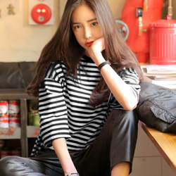 ulzzang巨袖斑马红白条纹中袖t恤女夏韩版学生百搭宽松七分袖上衣