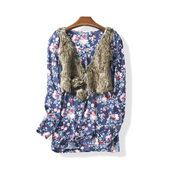36672 春秋季新款假两件毛马甲复古长袖上衣印花T恤女打底衫8月2