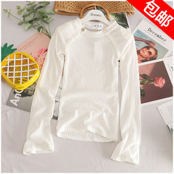 包邮 秋季新款喇叭袖纯色高弹力修身套头针织衫女27306