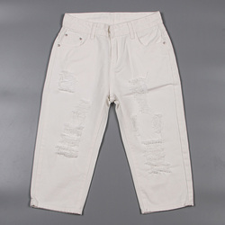 新款韩版纯白色显瘦中裤7分卫裤高腰宽松破洞大码MM牛仔女A44