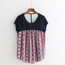 O16D夏季新款女装 碎花几何拼接短袖上衣2018圆领民族风露背T恤