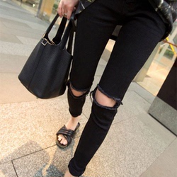 软妹春季新韩版高腰chic牛仔裤女九分裤紧身黑色破洞小脚铅笔裤潮