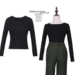 万能基本款气质经典黑色短款露腰圆领坑条打底针织衫春秋长袖女装