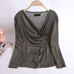 打底衫女九分袖春新款金银丝网纱不对称性感V领上衣收腰T恤小衫女