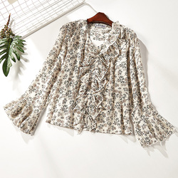 清货2018早秋新款时尚百搭V领印花荷叶边雪纺衫上衣916