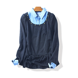 36500 春秋季新款女韩版翻领百搭长袖T恤荷叶边修身假两件9月11