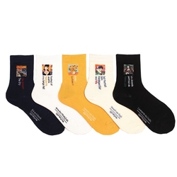 喵兔韩国进口袜子正品全棉复古女袜个性竖条名画女士中筒袜短袜