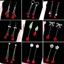 潮款喜气红珠子花朵水钻长款流苏耳环气质珍珠耳坠女式时尚装饰品