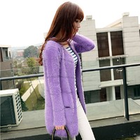 淑域 2014秋装新款 韩版简约中长款针织开衫马海大码外套女士毛衣