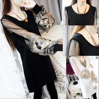 大码小衫女长袖春秋韩版潮女装网纱上衣中长款t恤女士长版打底衫