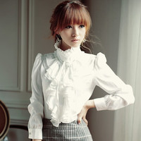 春夏季女装韩版文艺森女宽松休闲打底百搭刺绣长袖衬衣衬衫白色